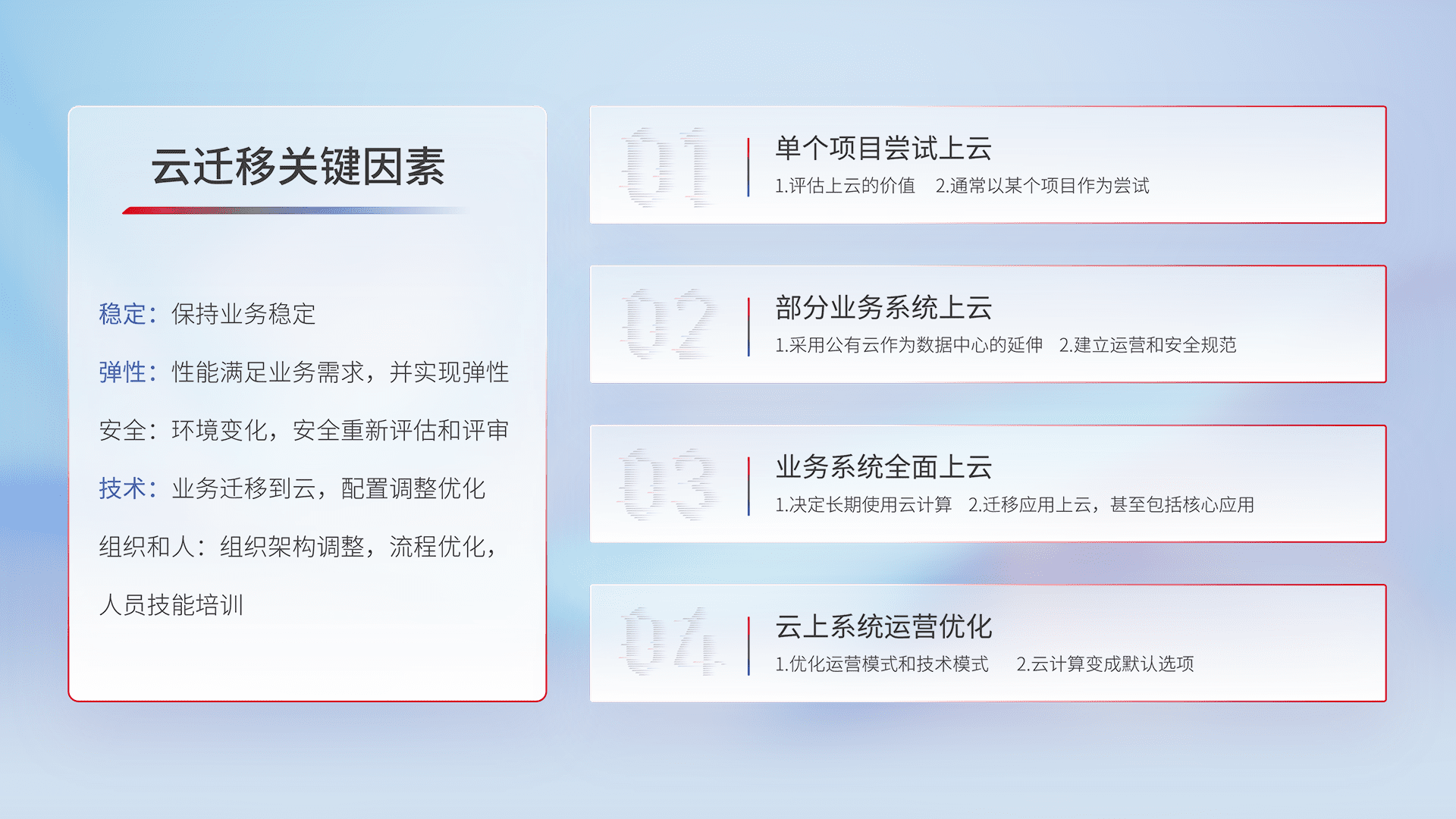结合实际业务,,,从规划设计、、、、云平台选型、、、云原生改造、、数据迁移、、集成交付,,迁移全过程为客户识别最佳上云路径,,,,做好风险识别管理,,设计网络架构、、、身份权限、、、、安全审计合规、、、、操作审计、、、、日志审计、、、、监控告警策略、、、、多站点容灾设计等,,,对云上基础设施进行整体规划,,提升IT治理水平,,,,以满足弹性、、、高可用、、、高性能的需求。。