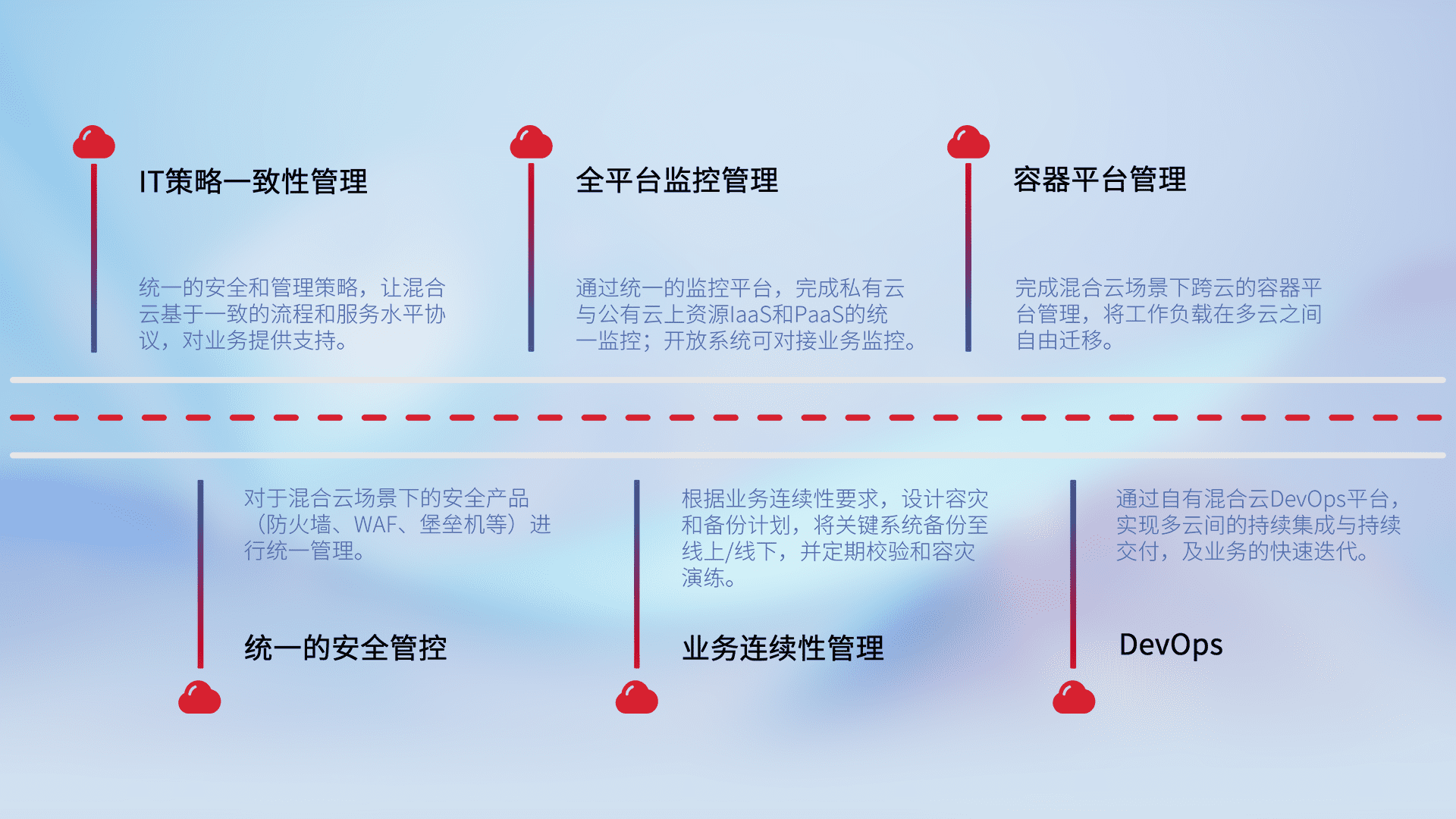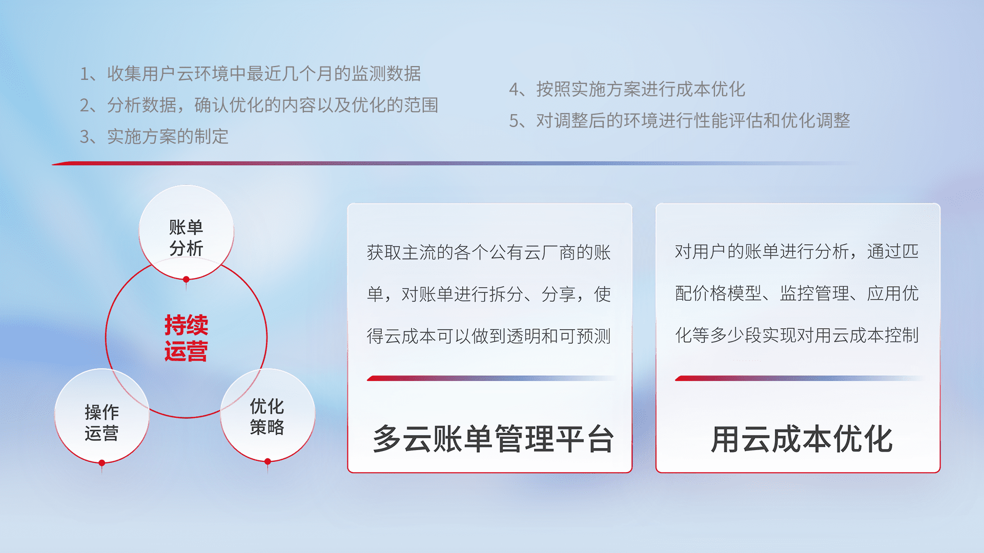 通过多云纳管,,,,以统一的资源数据模型把客户的云资源进行抽象和封装,,进而实现对多云资源的统一操作,,,保障云资源管理的可靠性、、、稳定性与可用性。。。量身定制化运维内容,,配置、、、、开发运维、、补丁管理、、、备份、、、监控、、、认证和访问管理、、审计和日常巡检等,,,,保障在用云过程中的可靠度,,,,稳定度以及高可用率。。。
