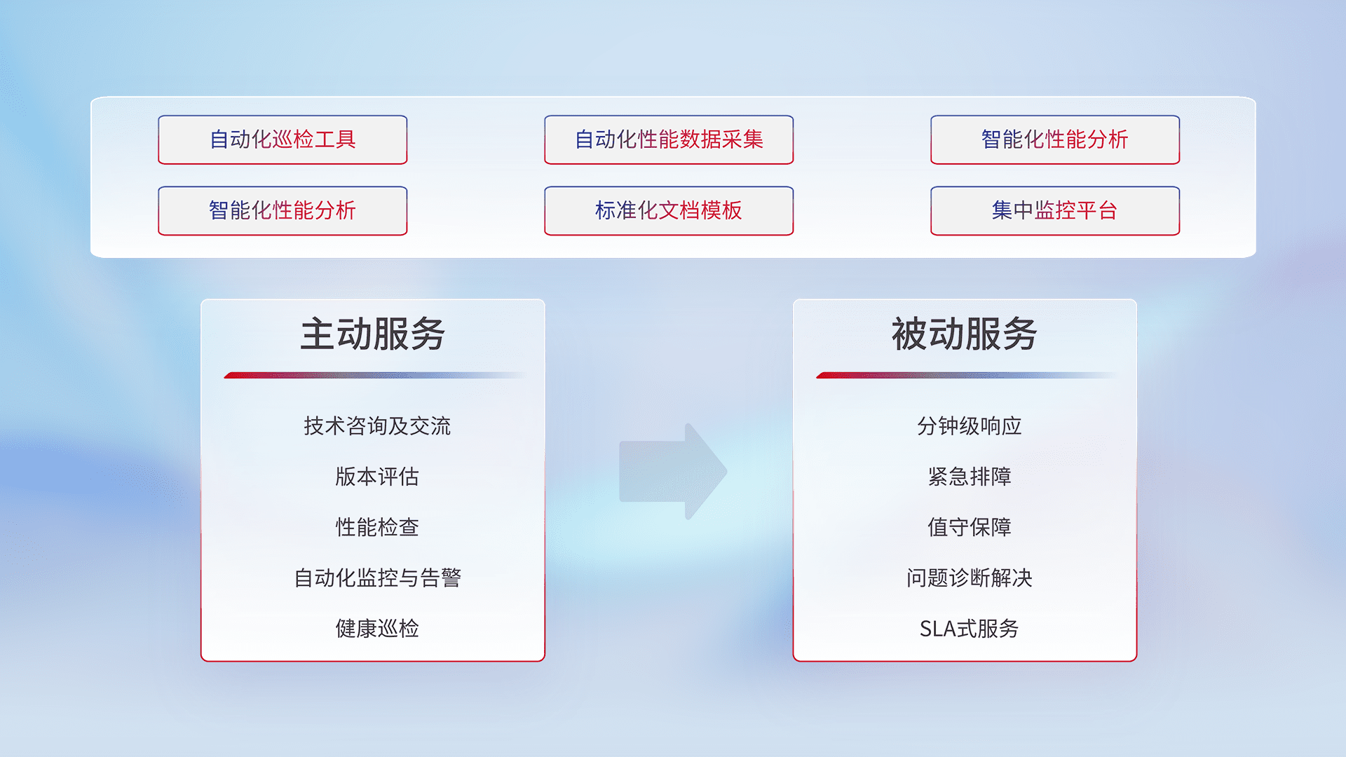 智能化工具和标准化文档,,,保障服务质量,,提供主动服务(包含技术咨询、、、、版本评估、、、性能检查、、、自动化监控与告警、、健康巡检)和被动服务包含(分钟级响应、、、紧急排障、、、值守保障、、、、问题诊断解决、、、SLA服务)。。。